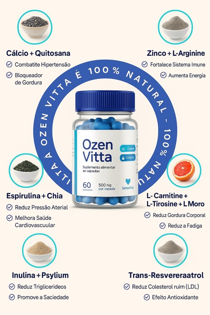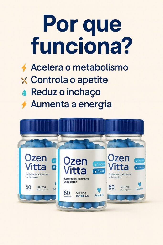 OzenVitta é um suplemento natural que combina ativos como chá verde, psyllium e fibras vegetais que auxiliam no processo de emagrecimento. Ele atua diretamente no metabolismo e no equilíbrio do intestino, o que pode favorecer a perda de peso de maneira saudável.
